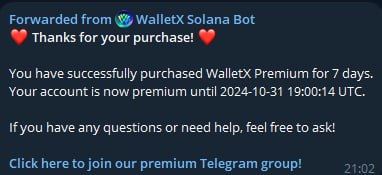 1. After payment confirmation for Premium, you'll receive a link to join "**WalletX on Solana Premium**" group<br>